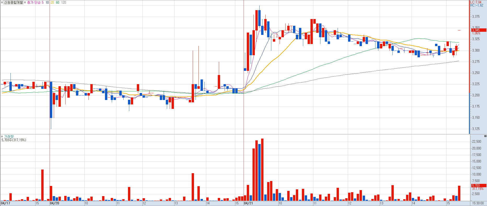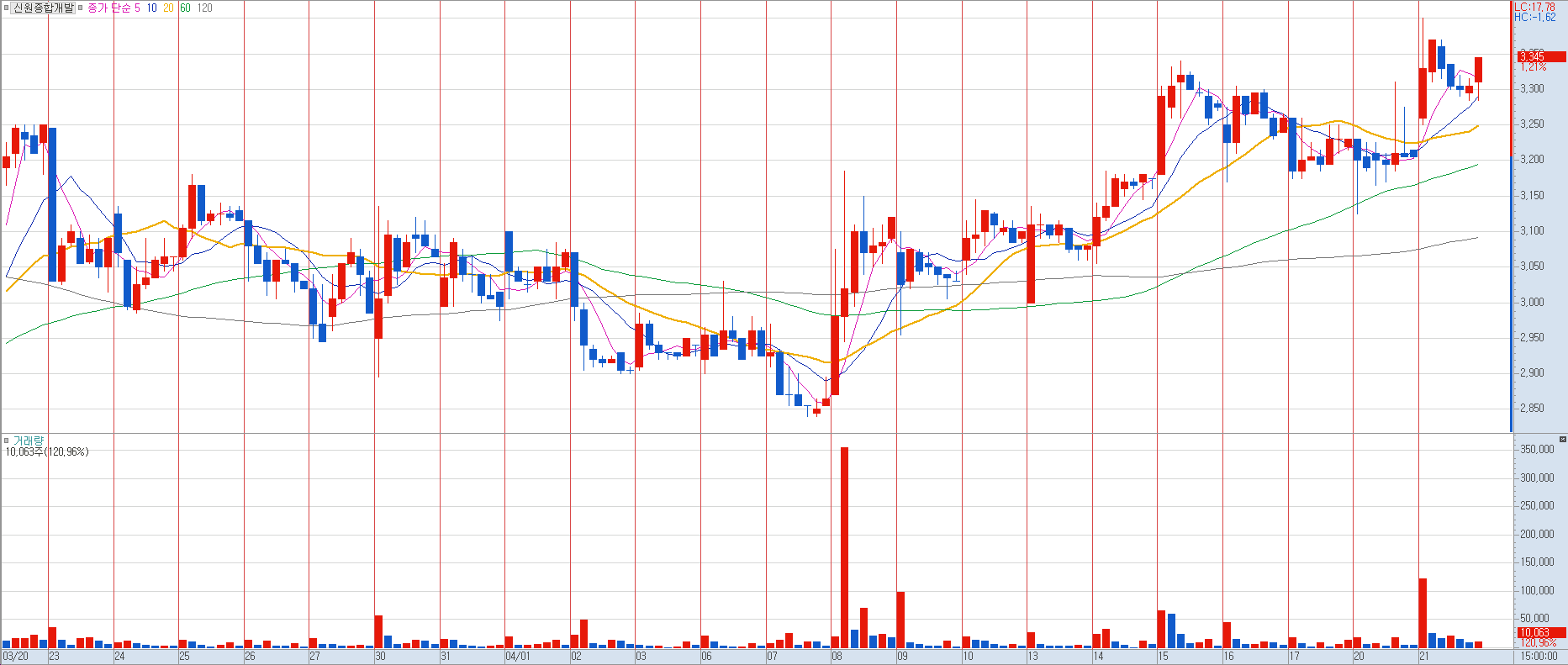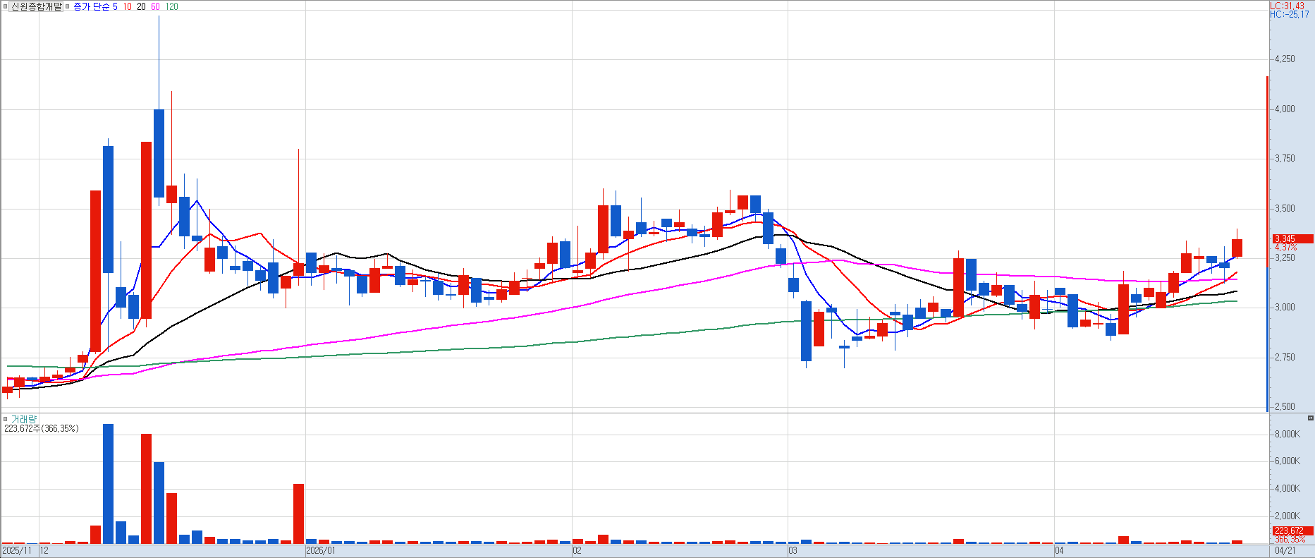 신원종합개발 일봉차트 26년 4월 21일 화요일 3,345원 종가 기준, 등락율 4.37% 상승 마감. 이 종목을 추천한 후의 움직임을 관찰해 보세요. 제가 드리는 주식 관련 정보는 매수 매도 하는 매매도 중요하지만 추천일 이후 움직임에 대한 공부가 더 중요합니다. 자본 변동성 체크 및 숨겨진 악성 매물대 추적