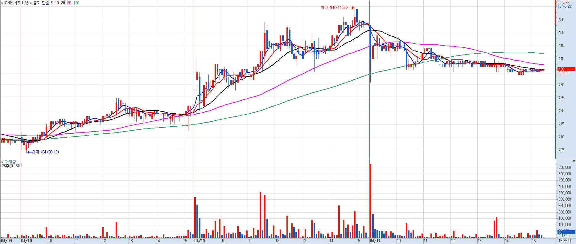SH에너지화학 26년 4월 14일 화요일 436원 종가 마감, 등락율 3.75% 하락 마감.