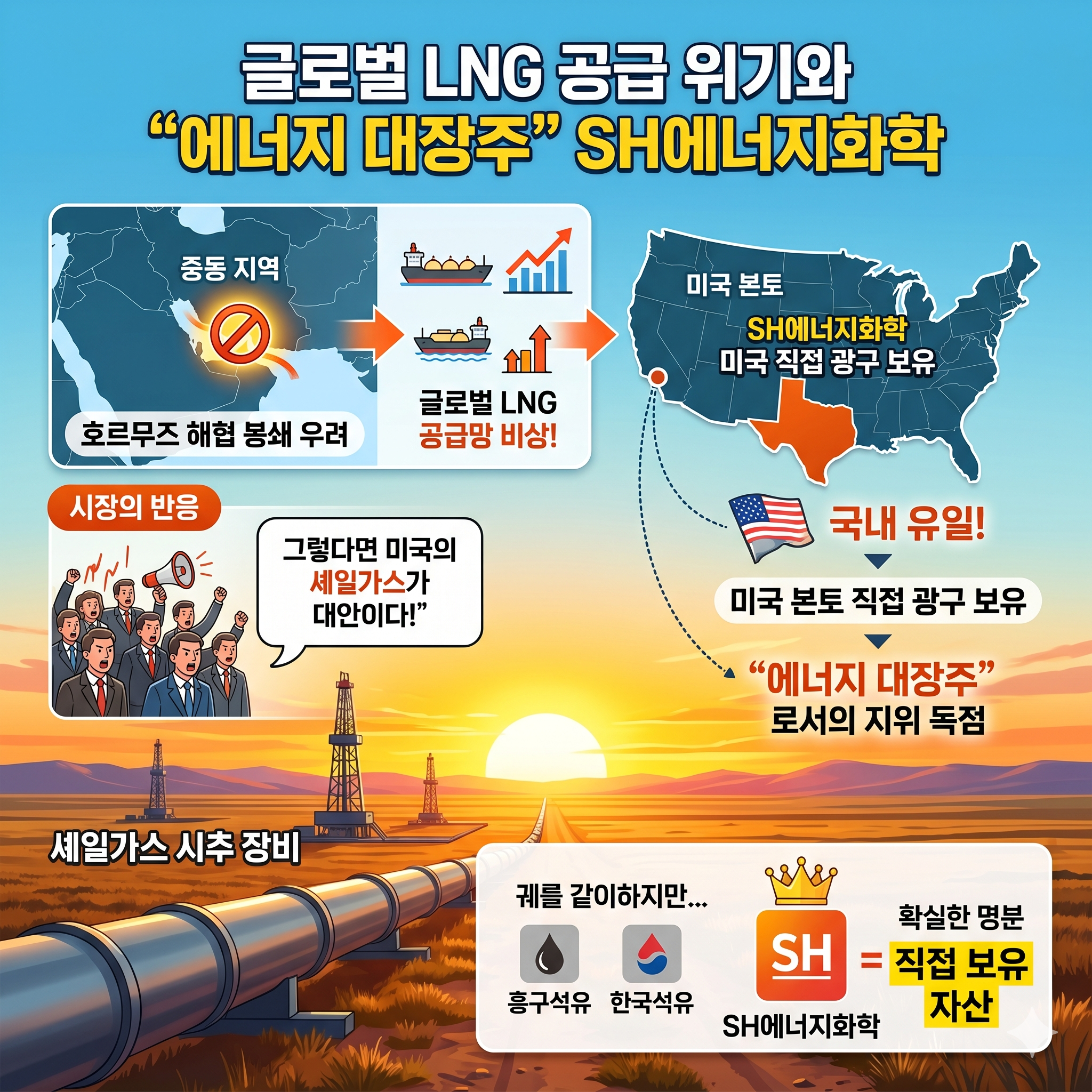 이때 국내 상장사 중 유일하게 미국 본토에 직접 광구를 가진 SH에너지화학은 에너지 대장주로서의 지위를 독점하게 됩니다. 흥구석유나 한국석유와 궤를 같이하면서도, '직접 보유 자산'이라는 확실한 명분이 있다는 것이 차별화 포인트입니다.