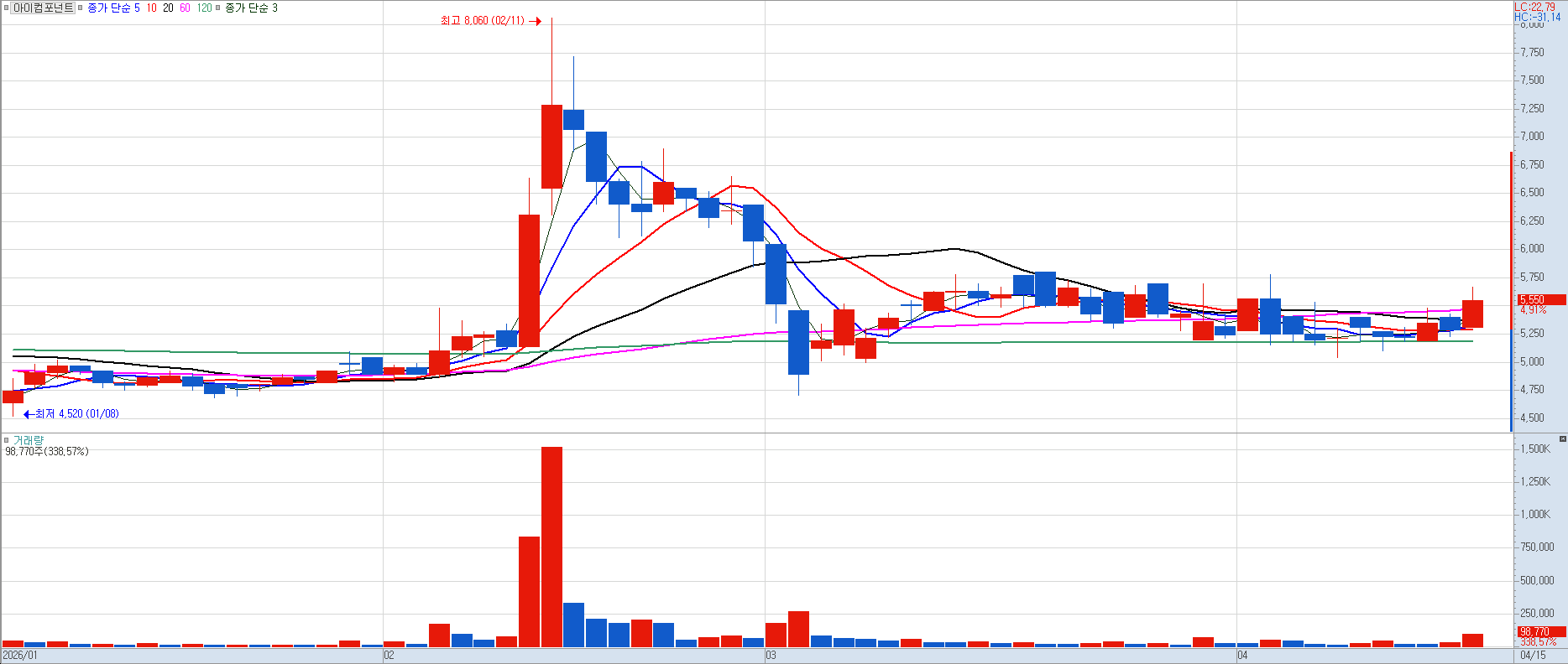 아이컴포넌트 일봉 26년 4월 15일 수요일 5,550원 종가마감, 등락율 4.91% 상승 마감. 현재가 5,550원 기준으로 아이컴포넌트의 시가총액은 약 860억 원 규모를 형성하고 있습니다. 다가오는 2026년 7월부터 코스닥 시장에 더욱 엄격하게 적용될 예정인 상장 유지 기준(주가 1,000원 미만, 시가총액 200억 원 미만)을 선제적으로 대입해 보아도, 이를 매우 넉넉하게 상회하는 안전 등급에 속합니다.