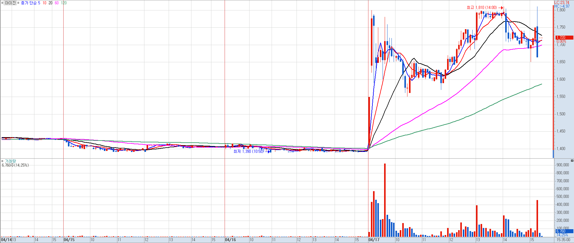 아이진은 금일 종가 기준 1,720원을 기록하며 전일 대비 23.21%라는 가파른 상승 곡선을 그리며 마감했습니다. 거래량이 동반된 장대양봉이 출현하면서 많은 투자자의 시선이 집중되고 있는데요.